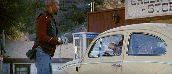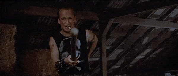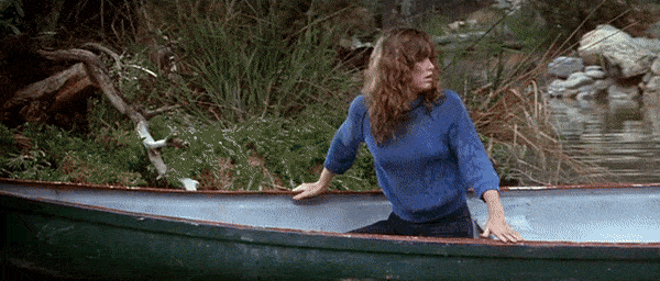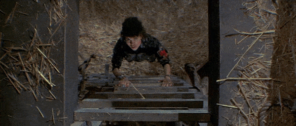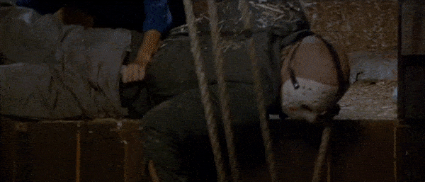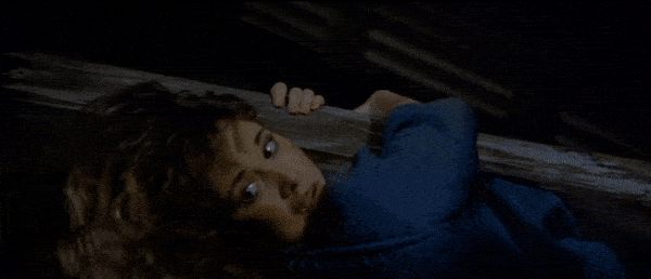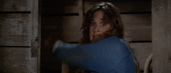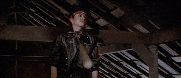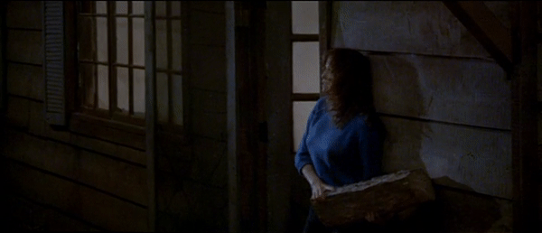 Friday the 13th: Part III is the perfect representation of the slasher film. Chris proves to be an incredibly effective final girl. The group of victims features the stereotypical characterizations of the jock, the stoners, and the prankster. There is a creepy prophetic man (the older man with the eyeball in his hand). The Higgins Haven barn is the perfect location for the killer’s cat and mouse games, as shown in the earlier gifs with the biker gang members above. It features the trope of the city vs. the country as the victims leave the city for their quiet Crystal Lake weekend. Miner’s film (his second Jason effort, as he also directed Part II) is definitely one of the strongest entries in the Friday the 13th canon. As with many of the slashers of the time, Part III also unfortunately features the trope of the black characters in the film being killed very early on. Fox (Gloria Charles) is a member of the biker gang, shown climbing the later in the above gif, that Jason kills one-by-one as they plan on burning the Higgins barn down after their encounter with Shelly and Vera in town. Charles gives a very charismatic and fun performance in the film, and it would have been so fun to see her character given more time on screen as she would be forced to pair up and combine forces with Shelly and Vera, but it was sadly just not meant to be. In the few moments she has on screen, Gloria Charles commands every second of them, giving more energy and life to her role than the majority of the other cast members. Charles sadly passed away in 2016. The biker gang’s other member Ali (Nick Savage) does live long enough to help Chris during the final barn showdown.