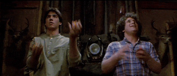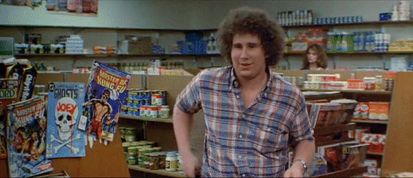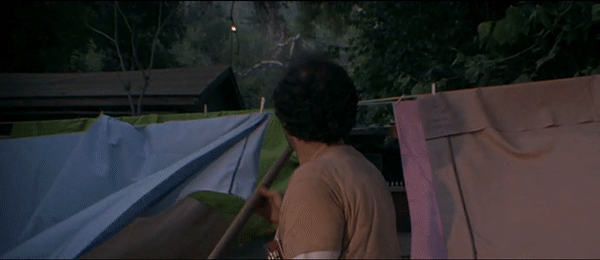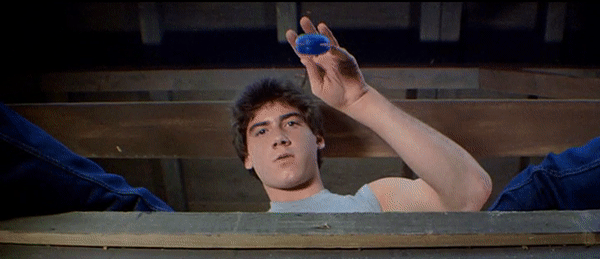 Like many slasher films, the group of victims of Part III is made up of four pairs. Three of which are legitimate romantic couples and the fourth is the blind date pairing of Shelly Finkelstein (Larry Zerner) and Vera Sanchez (Catherine Parks), shown in the wallet-throwing and car window-breaking gifs above, which is obviously not going to work out. Zerner’s Shelly is the prankster of the bunch, which puts him towards the top of the killer’s list of victims. Credit where credit is due, however, as it is Shelly who provides Jason with his iconic hockey mask, as he uses it on a prank to scare Vera, foolishly thinking that scaring a girl will make her fall into his arms. Debbie Klein (Tracie Savage) and Andy (Jeffrey Rogers), as shown in the fun yo-yo gif above, add another disturbing element to the film. When Debbie is introduced, we are quickly made aware that she is pregnant, proving that no life is safe when it comes to Jason.